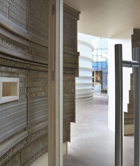 瓦楞紙的特殊紋路在室內空間形成猶如壁紙般的視覺效果