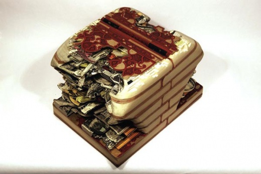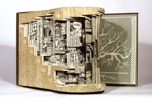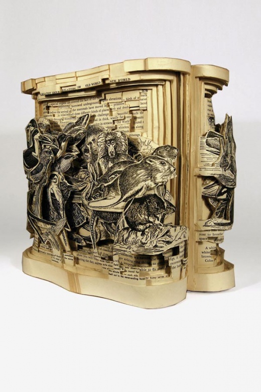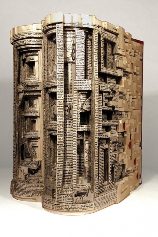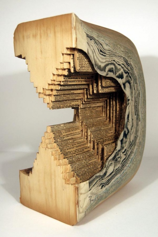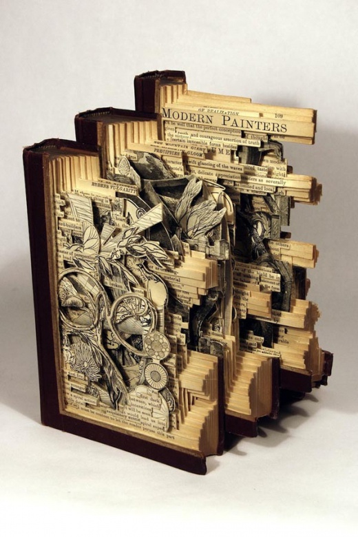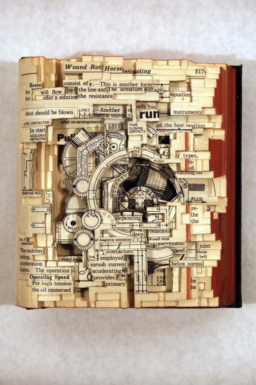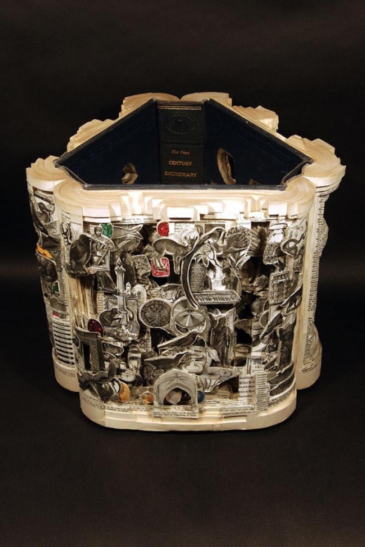 在創作的過程當中,Brian不會隨便撕掉書頁,或是在書頁之間夾上什麼新的素材,而是經過縝密的計算之後,精確的一層一層、一頁一頁的裁減掉他不需要的部分,如今,經過這幾年下來,他的功力已經從一次雕刻一本書,提升到一次雕刻一套書。