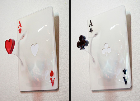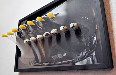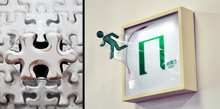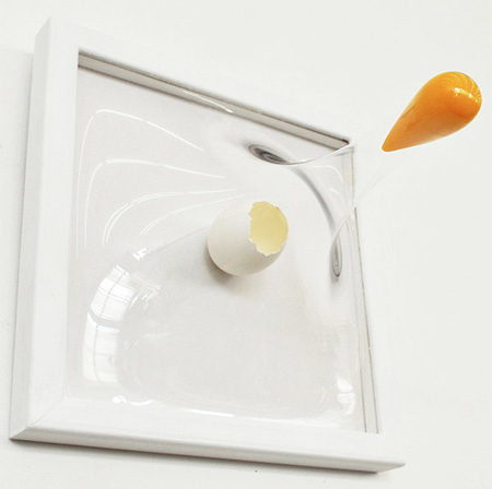 Matsueda設計了一系列讓你直接拔掉3D眼鏡也可以看到超立體的創作作品,逃生梯的LOGO小人直接像是真的要逃出安全門一樣,撲克牌的國王皇后也硬是要擠出玻璃框一樣,而一些著名的禁止標誌變成立體化之後感覺好像沒那麼顧人怨了,尤其討喜小姐自己最喜歡裡面雞蛋和水彩顏料的作品,真實世界的行為一旦被藝術化之後的時空凝結感,更是讓人有種處處皆是藝術之感阿!