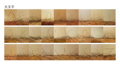 Kanazawa創造出了或許可以說是世界上最怪異的字型設計:腿毛字型!這些看起來相當細膩的作品並不是用電腦處理的,而腿毛字型的靈感則是來自於一位體毛濃密並且時常抱怨腳痛的朋友(朋友表示:躺著也中槍)。Mayuko