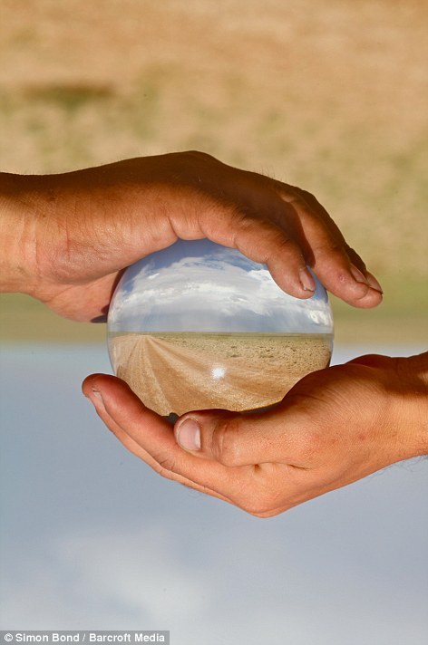 上下兩隻手創造了一種平衡感。一雙倒過來的手握住一個玻璃球,在玻璃球上,你能看到沙漠風景。