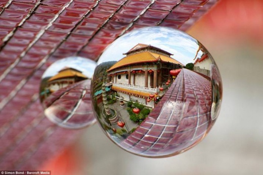 一位英國攝影師拍攝了一組奇妙照片,景色倒置在玻璃球中,顯得格外不同。在這些驚人的折射光照片中,一個水晶球容納了一座寺廟。在這張由英國攝影師西蒙-邦德拍攝的照片中,馬來西亞檳榔嶼島極樂寺出現在一個玻璃球中。