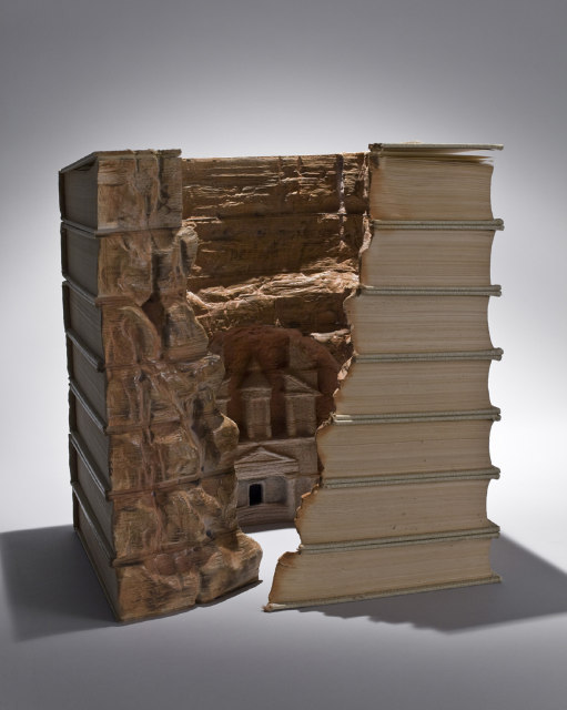 書除了可以拿來看之外,其實也可以拿來當做雕刻作 品的材料。一位叫做 Guy Laramee 的藝術家,就利用 厚重的書本、封皮為材料,雕出了一件件可以用鬼斧神工來形容的超 優質書雕刻。雖然 Guy Laramee 並不是這世上唯一 一個的書雕刻藝術家,但他的書雕刻主題並不是個人藝術創意的自由 發揮,而是選擇用細膩的彫刻手法,用書本來重現世界上著名的歷史 遺跡或自然景觀,跳轉後來欣賞一下 Guy Laramee 細 膩又出神入化的書雕刻吧。