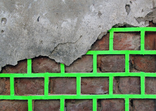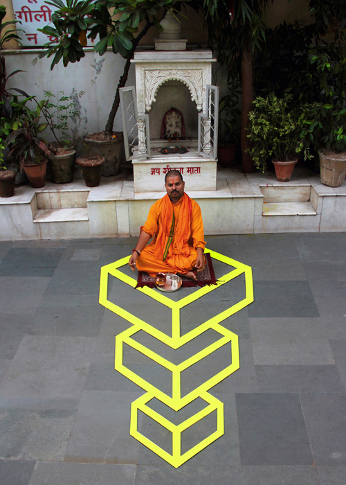 除了紐約之外,Aakash Nihalani 也在印度、長島等地留下足跡,像上頭這項作品就叫作『Inside Out』,位於印度新德里街頭,利用寬板紙膠帶在牆上貼出一個虛擬空間,用的依舊是招牌亮晃晃的螢光桃粉色!(閃亮)