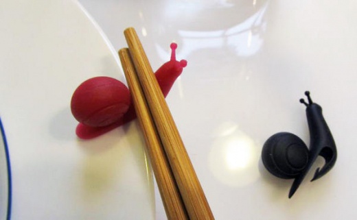除了固定在杯緣之外,如果往盤邊一夾,立馬就變身為筷架,利用矽膠材質本身的磨擦力,讓蝸牛可以穩穩地固定在任何材質的杯具器皿上。