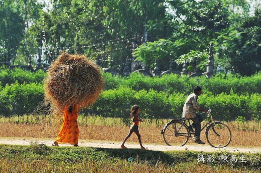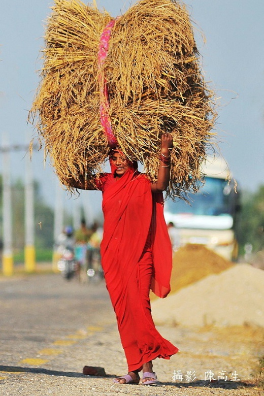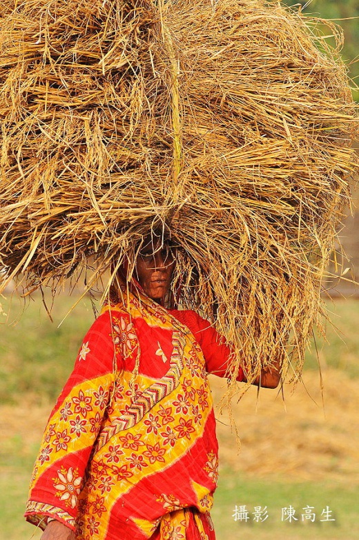 在這裡什麼都頂,盤子、臉盆、洗衣盆、塑膠罐、用具、食物、布袋、行李、大儲水桶、木材、資源回收…牛糞也頂,只要你想的到、用的到、需要攜帶統統都頂。最讓我欽佩的是「頂稻子」,稻子不是一把或一些,而是好大一大堆,我幾乎都搬不動,而他們弱小的身軀卻頂著跑。
