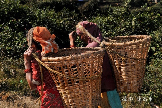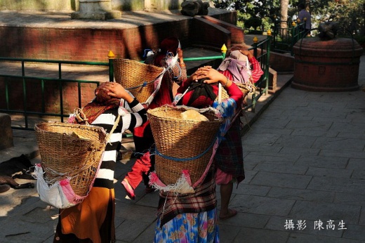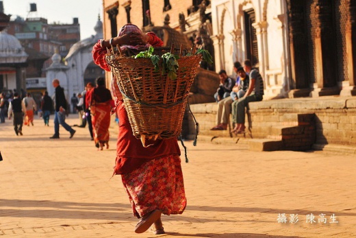 尼泊爾很少看到有人用手拿貨物,除了汽機車就是用腳踏車和獸力車在載貨物,除此之外,就是以「人力」負載各種物品。從加德滿都到珍納普,一路走來看到的人力負載有所不同,加德滿都附近都以頭部「背籃」為主,將貨品以籃子吊背在頭頂與背部,而離開首都往珍納普的方向,越來越多人採用「頭頂載物」。