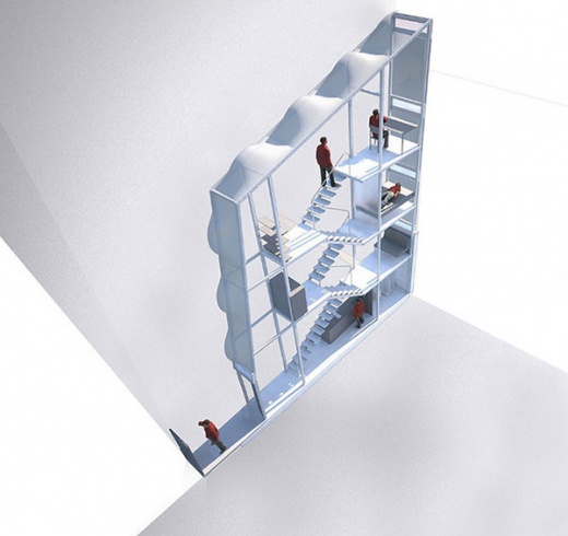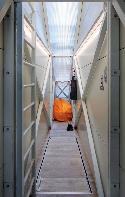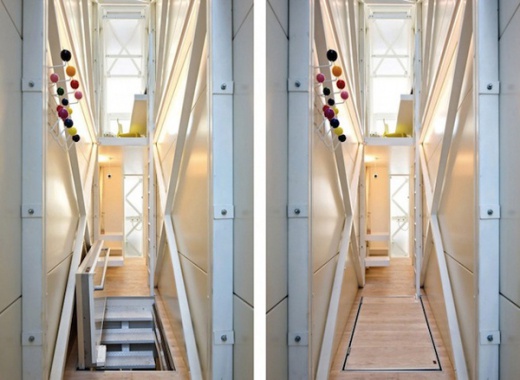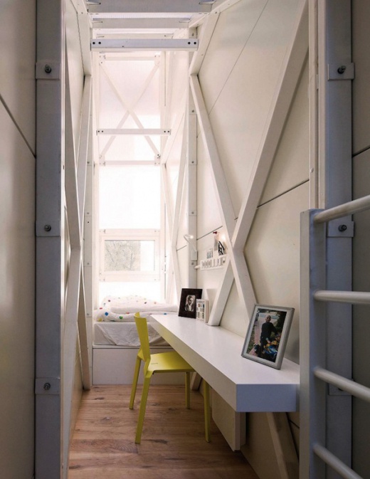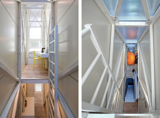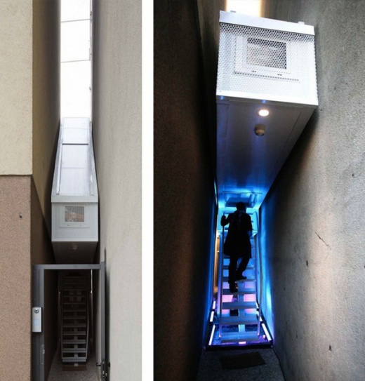 這棟房子是由「Centrala」設計團隊設計的,位於波蘭首都華沙的市區中,最寬133公分,三層樓,這棟建築實質上是不能當做一般家庭居住的,它被歸類在裝置藝術的領域,但麻雀雖小五臟俱全,該有的還是都有,臥房、浴室、廚房都有,理論上要在裡面生活不困難,除非你有幽閉恐懼症XD