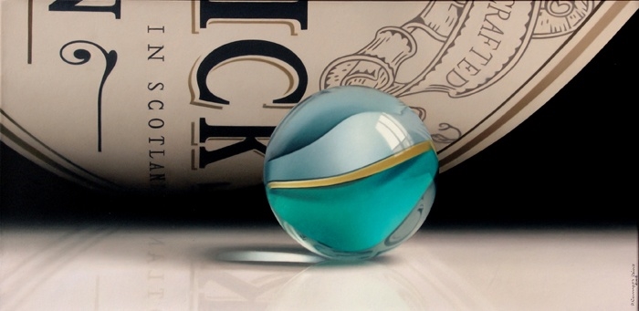 不要只留心光線是如何讓玻璃窗的反射映在玻璃珠上(而且如此的一致,毫無違和感!),也看看背景的構圖吧…看字母扭曲的程度看,相信是個瓶子…沒有比常人更厲害的技術和更細心的觀察力是做不來的!