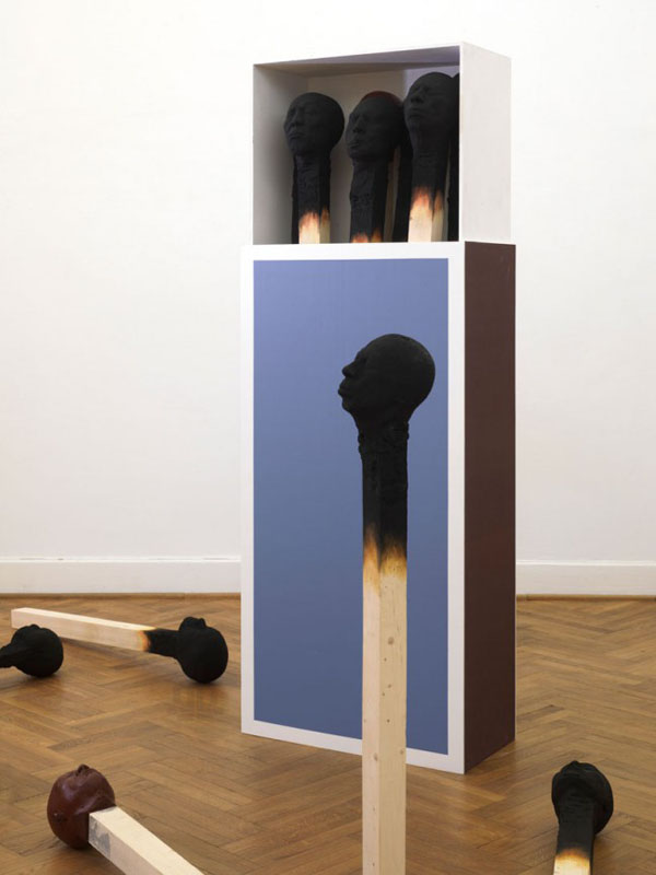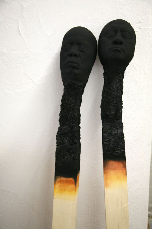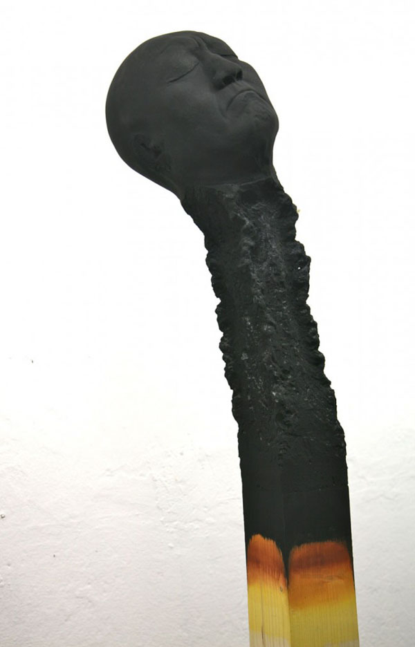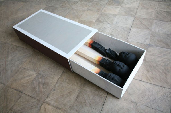 德國藝術家 Wolfgang Stiller 將燃燒到盡頭的火柴,雕塑成人頭的樣子,並將系列作品取名為「burnout 職業倦怠」,這些躺平的火柴人面目不算是十分安詳,躺在火柴盒中就像是安息了一樣,一片焦黑的火柴頭可以看到頸部有點損壞,就像是經過了無數磨難的辛勤人們。