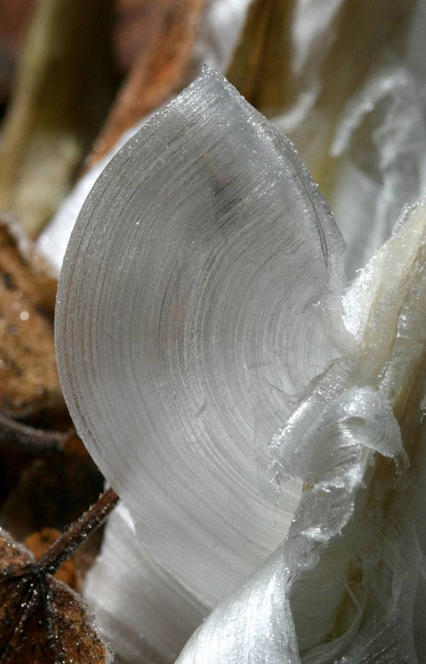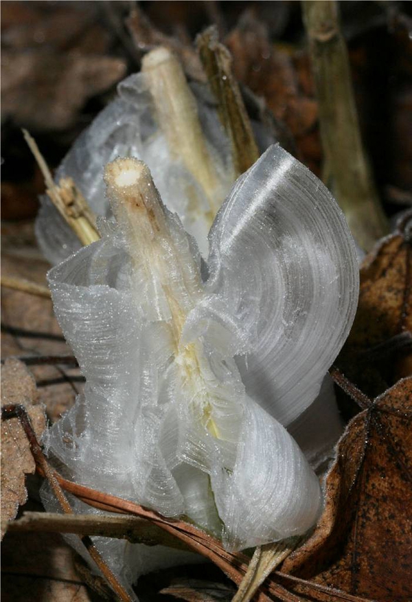 但這樣的冰花需要形成的條件很嚴苛,除了天氣溫度要相配合之外,還要遇到條件符合的植物,隨著溫度越來越冷,越來越冷,最後炸裂出的不只是水份,更是形成冰霜凍花的美麗條件。這些片狀的冰霜不只易碎,還帶著白白的顏色,有的是半透明像玻璃一樣,一片片的冰片正是因為順著植物莖直線破裂造成的,看起來就像是某種感覺很好吃的糖果。(哎呀!是糖蔥)(右手搥左手心)