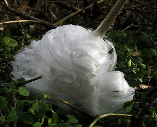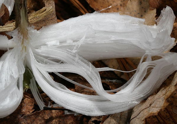 「冰霜凍花」聽起來感覺像是某個好吃的果凍,又像是什麼美麗的花朵,事實上這是一種相當稀有的自然現象,通常會在秋冬交接之時、或是初冬的早晨,當溫度快速下降後,植物的莖或是吸飽水份的木材,因為結凍被擠壓,造成外皮破裂,噴出的汁液快速凝結,就變成了好像龍鬚糖一樣彎曲摺疊的冰霜凍花了。