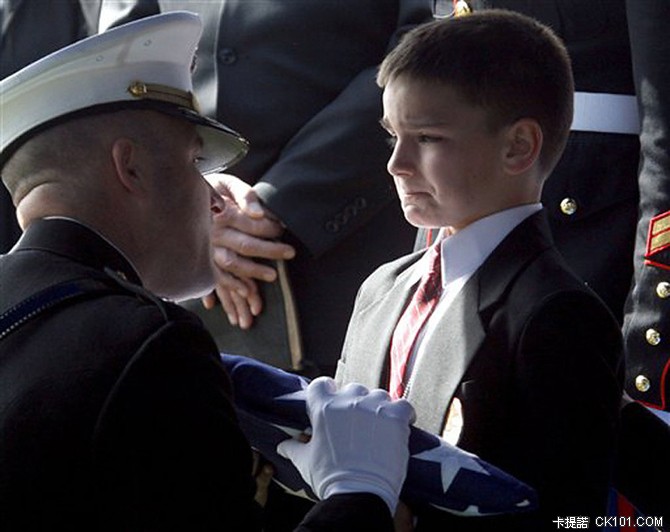 ▲一個八歲的孩童在父親的追悼會上接過美國國旗