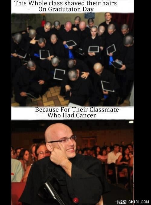 ▲畢業典禮上,全班同學都剃成了光頭。因為他們的一個同學患了癌症。