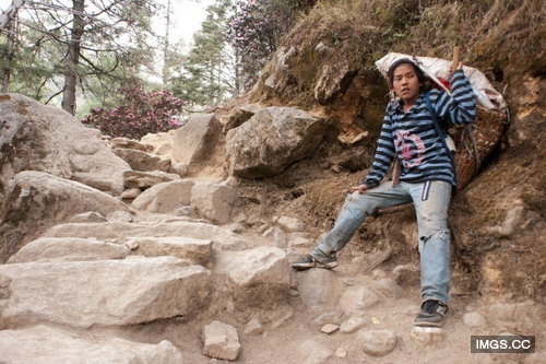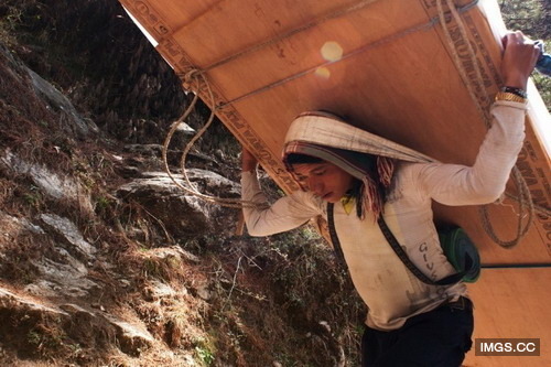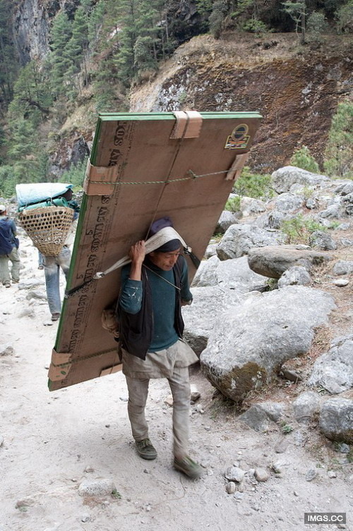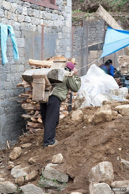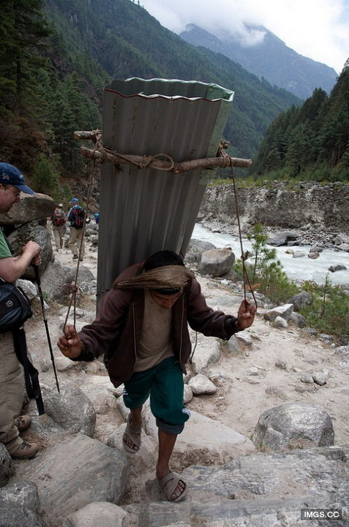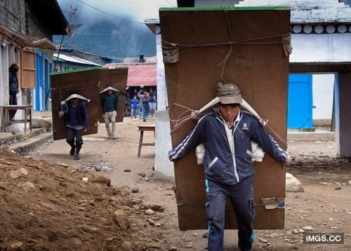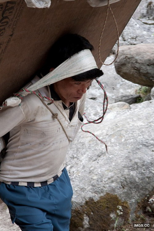 搬運工背的木板重達150公斤左右,行走在崎嶇不平且氧氣稀薄的山區十分艱難。