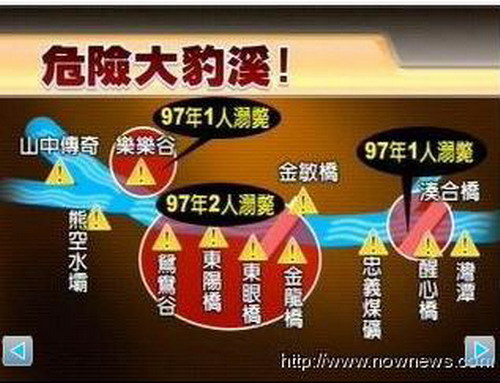 大豹溪溪水碧綠而清澈,但溪中有許多巨石,以致形成很多游渦與迴流,使得許多民眾因為在漂亮的水色誘惑下而疏忽了自己的安全。這裡每年夏天都溺死不少人,其中有很多是民眾穿著衣服與長褲就下水游泳,以致游泳時腳部的重量增加而抬不起來,最後體力透支而溺水。