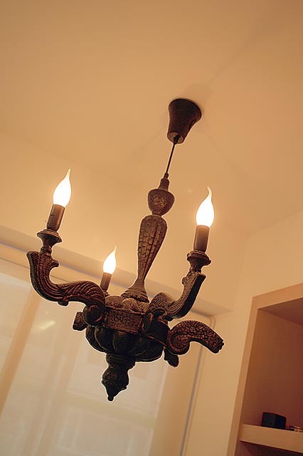 我滿喜歡書房垂掛的燭台吊燈。這盞吊燈帶點簡單的花紋,暈染上濃濃的煙灰色,跟那些枝節橫生、精雕細琢的水晶燈相比,少了份張牙舞爪的美麗,卻利落了多,尤其襯托它的是一色刷白的牆壁與天花板,就像位雪白的女子,刷上了時尚的煙燻妝。只是有點可惜,吊燈漂亮是漂亮,只是怎麼缺了一角?