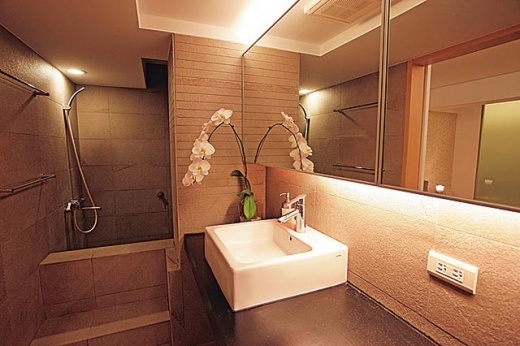 浴室採用義大利進口板岩(每坪約NT$6,500),融合了羅馬浴池和日本湯屋的感覺。