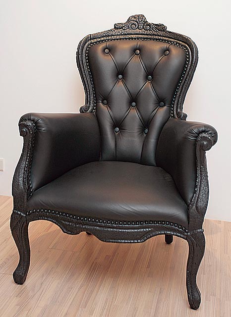Chair,銅釘將渾厚的牛皮椅背壓印出古典的花紋,同樣是被煙燻得焦黑,這張椅子不僅出現在Beyonce的MV〈Upgrade
