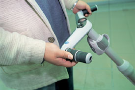 ▲龍頭上的藍色鈕為電動前進開關,不用推,按著鈕它會自己前進。