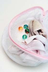 在洗衣網內,放入襪子以及約十顆左右的彈珠,利用彈珠與襪子碰撞之間,將髒汙從纖維之中揉搓出來。