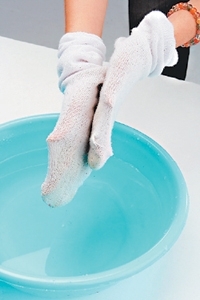 在水盆內放入約七分滿的水與1/2到1小杯的醋量,將髒襪子浸泡一晚,