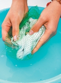 超市用來裝蔬果的網袋別丟,拿來廢物利用洗襪子,效果比刷子更好。將髒襪子和少許洗衣粉放入網子內搓揉,汙垢較易洗乾淨。
