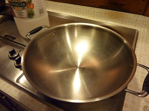 然後準備一個鋼刷..... 用滾燙的醋把鍋子內面... 整個用力刷洗.....